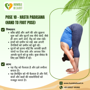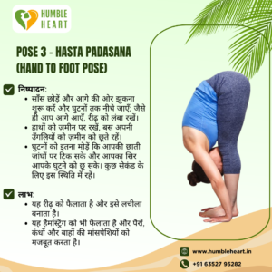 Flow into Padahastasana (Standing Forward Bend) – Exhale and bend forward, touching toes.