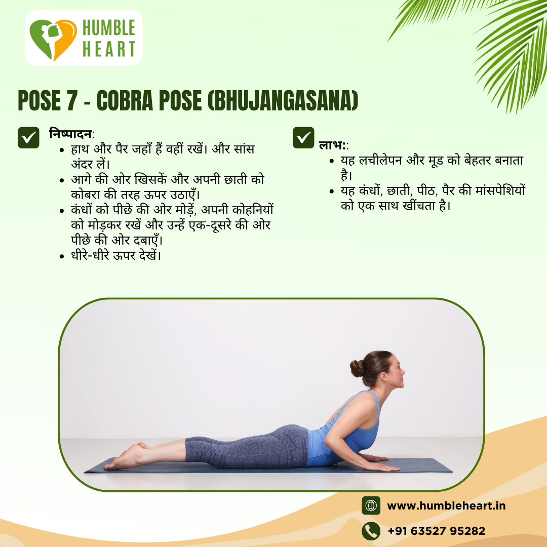 Arch into Bhujangasana (Cobra Pose) – Lift the chest and stretch forward.